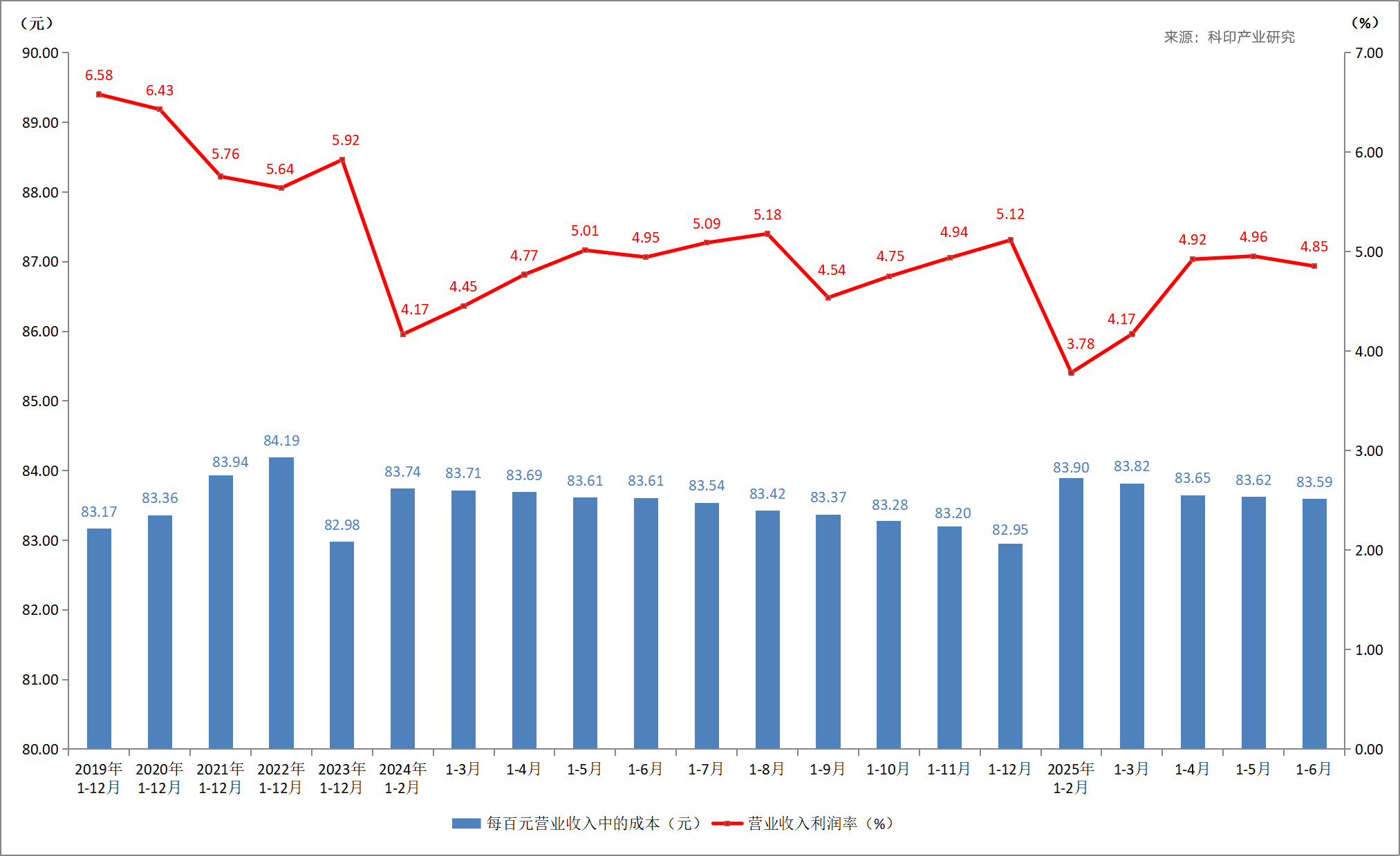 2025年1-6月,印刷业每百元营业收入中的成本为83.59元,相比上月略有下降。这一数字低于全部工业85.54元的平均水平。
