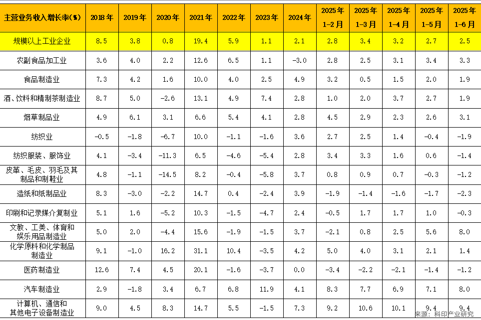 表中显示,2025年1-6月全部工业主营业务收入平均增长2.5%,营收增速较上月下降0.2个百分点。